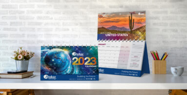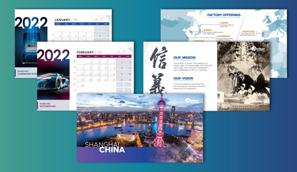 The first few years of designing desktop calendars for Amkor Technology we maintained a similar format of keeping the calendar graphics with imagery on the same front-facing page. For the 2023 calendar, I wanted to give users an option of hanging the calendars as a traditional wall calendar while keeping the tabletop tent stand as a standing base option. Working with the local print vendor, I was able to achieve this functionality and we received tons of positive feedback.